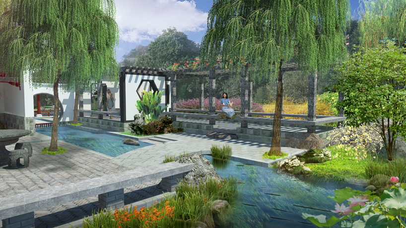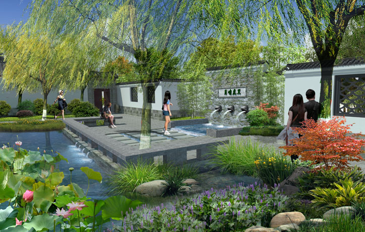 北水:通過大面積水景,結(jié)合泉、荷、小橋、垂柳、景石等元素展示濟(jì)南的湖光美景。