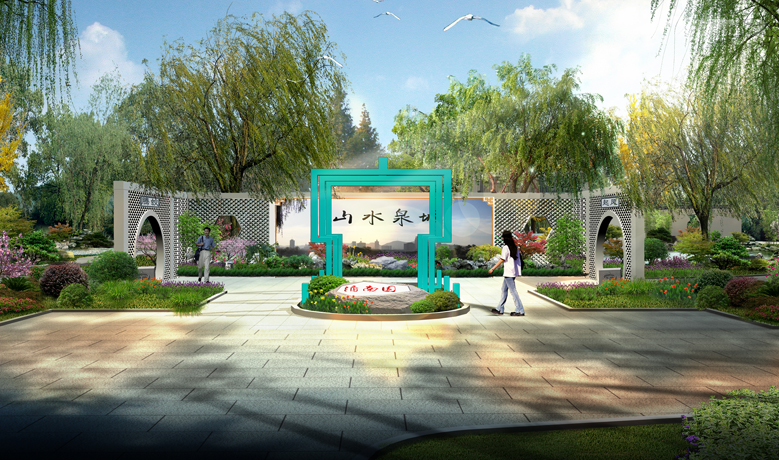 展園運用傳統(tǒng)園林造景手法,融入現(xiàn)代設計元素,將柳樹、荷花、反映泉城景觀的壁畫、“泉”字符號及景門、疊石、水榭、石刻等融入園中,描繪了一幅悠然濟南的生態(tài)綠意畫卷。